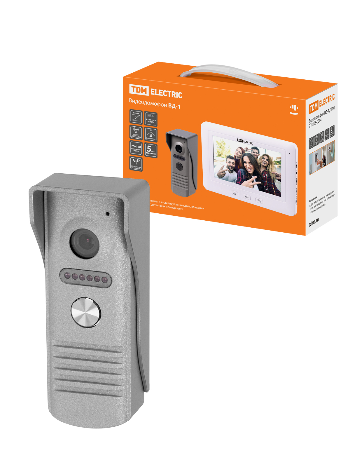 Видеодомофон ВД-1 (размер экрана монитора 7 дюймов, разрешение экрана 0,4 Мп, разрешение видеокамеры вызывной панели 700 ТВЛ, кнопка разблокирования замка), TDM
