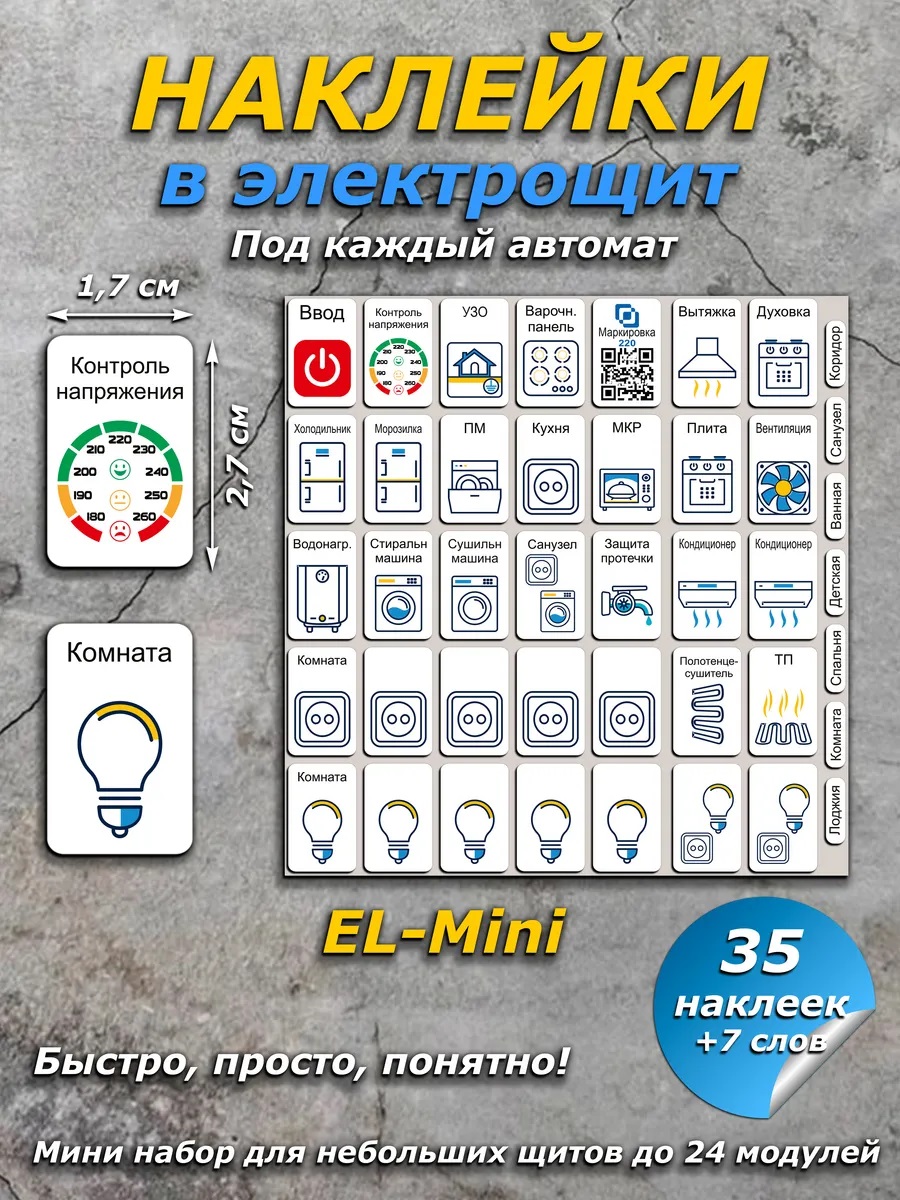Маркировка для электрощитов (мини набор из 35 наклеек с разнообразными потребителями), с очень понятными пиктограммами в формате отдельных наклеек на щит под каждый автомат сделанных в едином стиле. Универсальной электромаркировкой легко подписать электрощит в квартире и доме, а так же внести дополнения и изменения в процессе эксплуатации щита! Для маркировки 220 не требуется предварительной подготовки, компьютер, принтер, только универсальные наклейки на щит, канцелярский нож (есть видео пример как правильно клеить наклейки на электро щиток) несколько минут свободного времени.