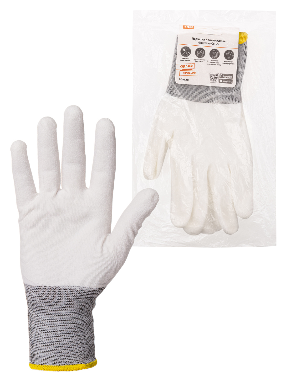 Перчатки полиамидные “Контакт-Сенс”, полиуретановое покрытие, 8, 15 кл., 27-28 г, 1 пара, TDM