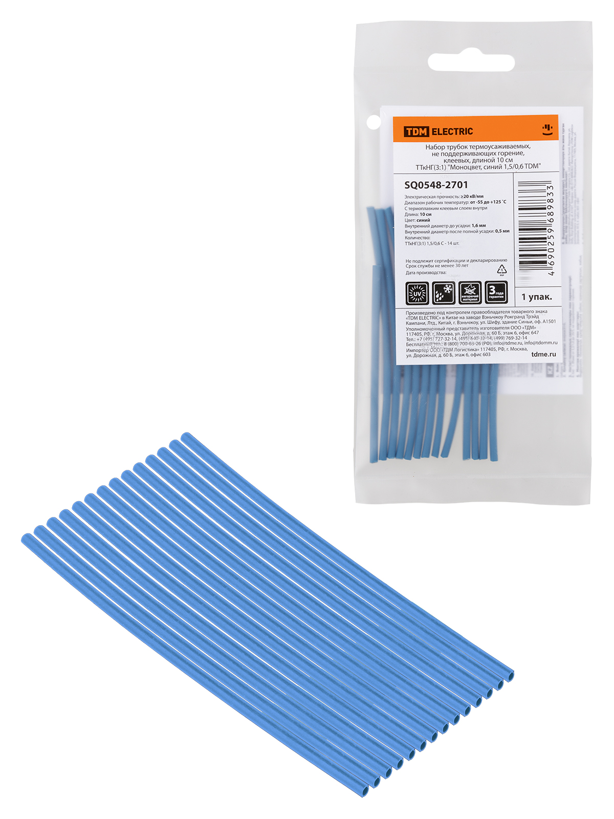 Набор трубок термоусаживаемых, не поддерживающих горение, клеевых, длиной 10 см ТТкНГ(3:1) “Моноцвет, синий 1,5/0,6 TDM”