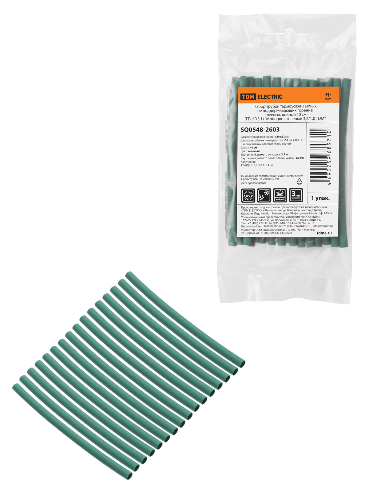 Набор трубок термоусаживаемых, не поддерживающих горение, клеевых, длиной 10 см ТТкНГ(3:1) “Моноцвет, зеленый 3,2/1,0 TDM”