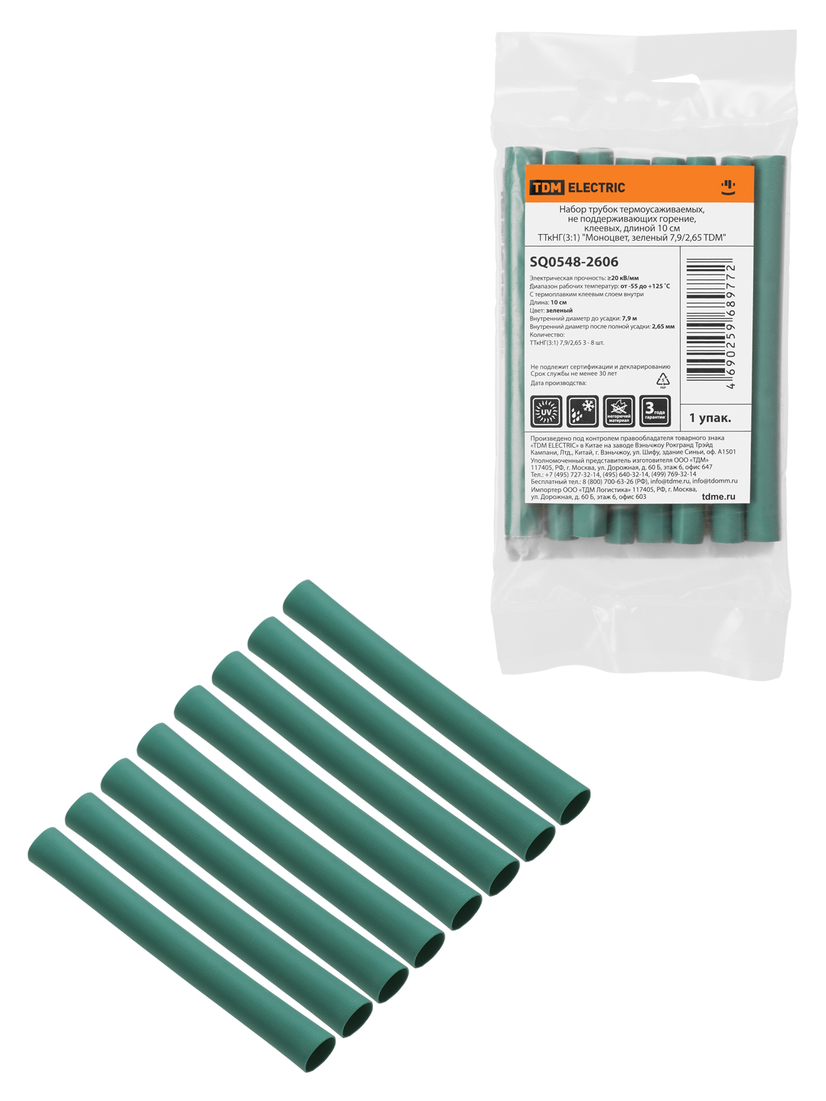 Набор трубок термоусаживаемых, не поддерживающих горение, клеевых, длиной 10 см ТТкНГ(3:1) “Моноцвет, зеленый 7,9/2,65 TDM”