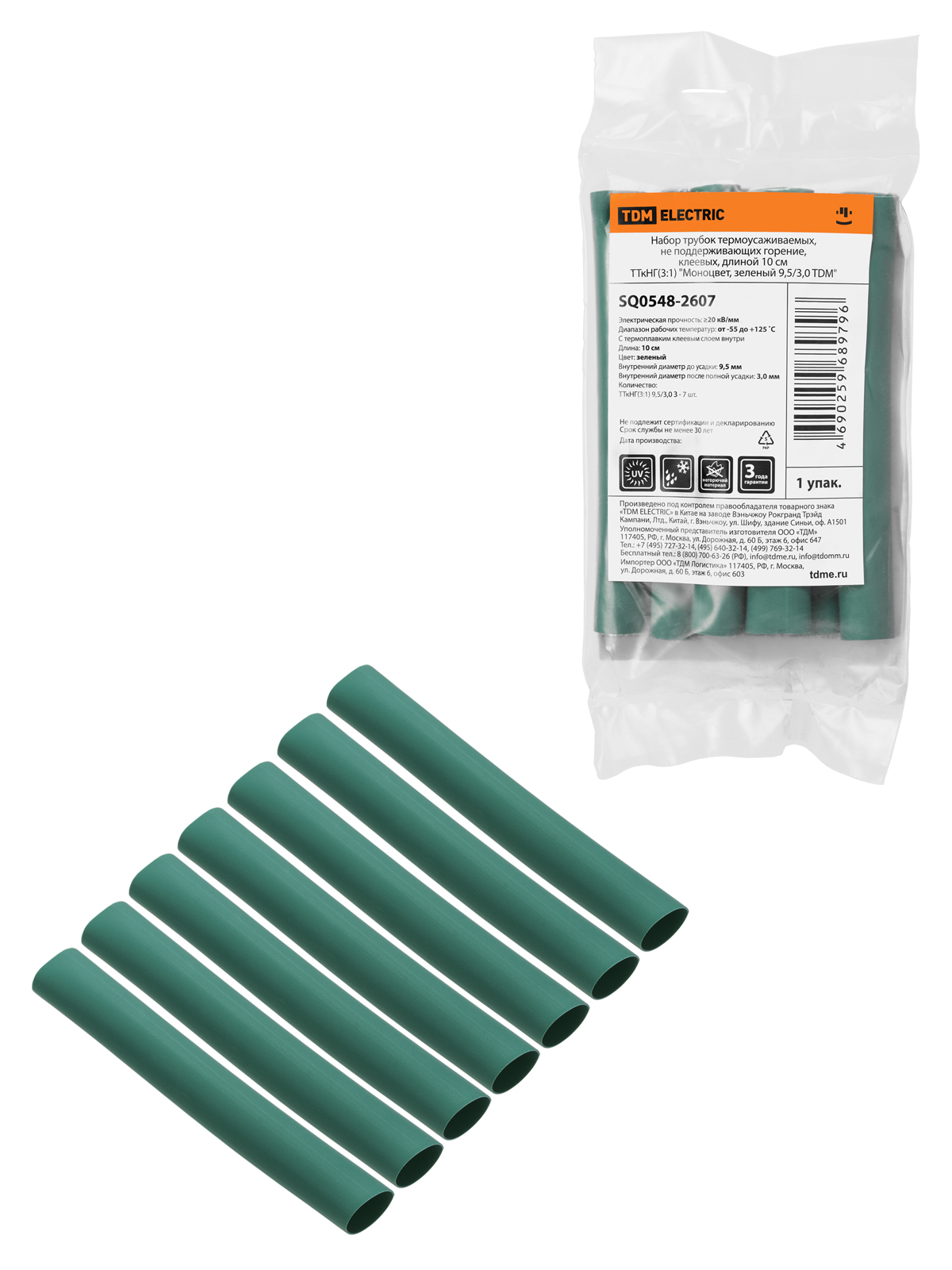 Набор трубок термоусаживаемых, не поддерживающих горение, клеевых, длиной 10 см ТТкНГ(3:1) “Моноцвет, зеленый 9,5/3,0 TDM”